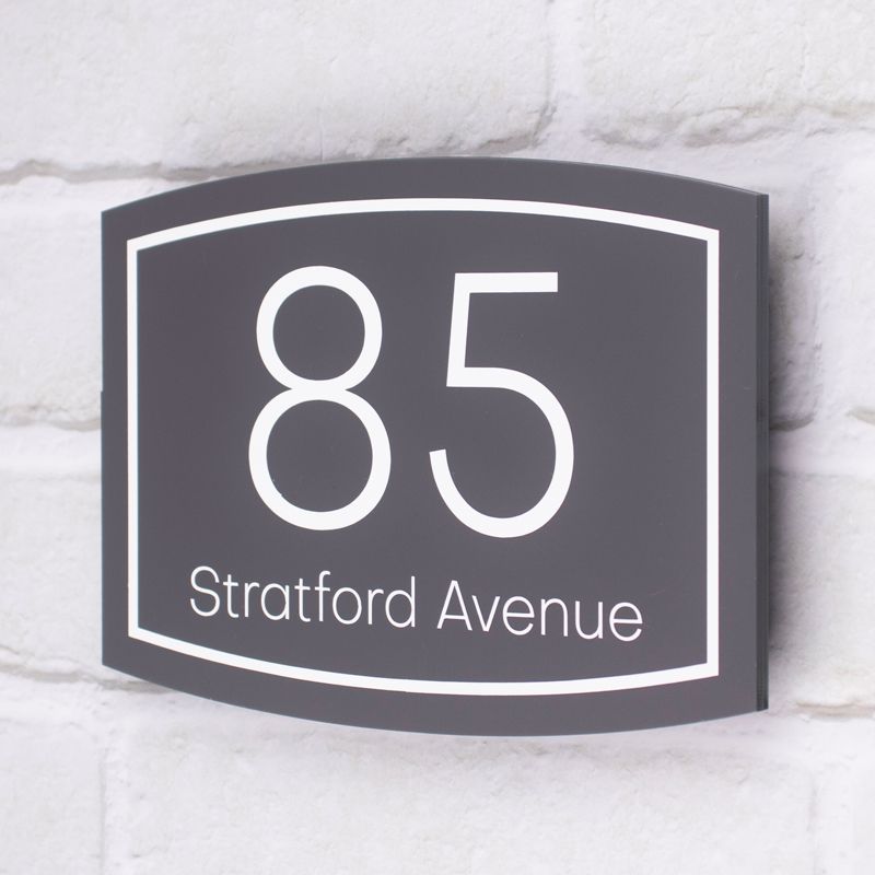 The Rimini contemporary modern house sign is produced from matt acrylic, & has hidden standoff fixings on the rear which allow the design to appear to float off the wall. Available in 3 stunning matt acrylic colours. The text is printed using specialist UV inks, which bond to the acrylic giving it a vibrant and tough finish